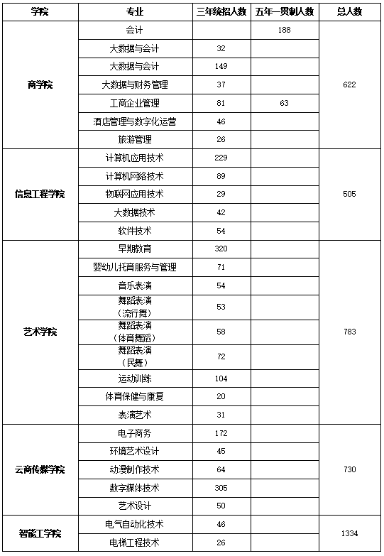 职教特色鲜明。学校现设有商学院、艺术学院、智能工学院、信息工程学院、健康学院、国际交流学院、五年制高职学院、继续教育学院8个二级学院,开设有高职专业58个、五年一贯制专业6个,涵盖了财经商贸、医药卫生、电子信息、装备制造、土木建筑、文化艺术、旅游等10个专业大类。现有教职工500余人,教师队伍中高级职称比例达36%、研究生比例达68.2%、“双师型”教师比例达70%。在校生14000余人。拥有1个省级高水平专业群、2个省级品牌专业群、3个省级特色专业建设点、1个省级职业教育教学创新团队、2个省级教学团队、3名省级教学名师、1名省级优秀教师、1名省级优秀思政课教师、12门省级精品课程和1门省级精品资源共享课程、1个省级职业教育名师工作室。近三年主持省级以上教科研项目60项,发明专利17项,发表学术论文累计200余篇。