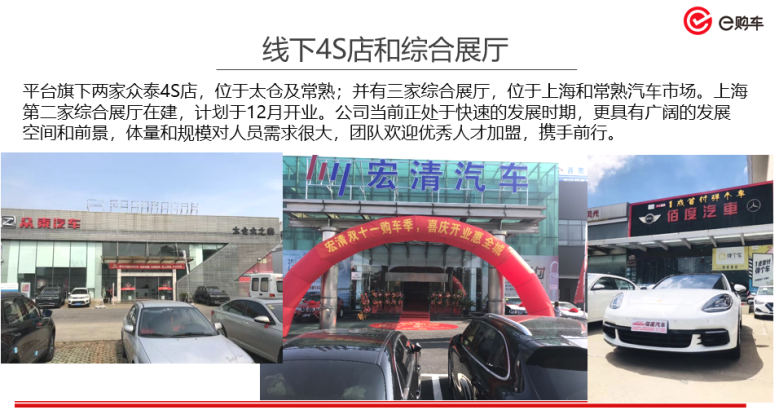 (1)e购车平台起点于第一家综合展厅——常熟佰度汽车,成立于2012年,位于常熟汽车销售市场,销量在常熟排名第一。目前e购车平台已发展成为一家集线下展厅、B2B资源、车商学院、线上平台等深耕于汽车流通领域的多元化发展的企业。