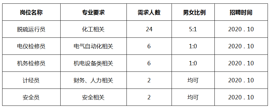 | 脱硫运行员 | 化工 | 24 | 5:1 | 10月 |