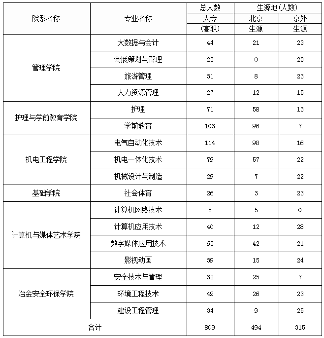 学院现设有管理学院、计算机与媒体艺术学院、护理与学前教育学院、冶金安全环保学院、机电工程学院、基础学院和继续教育学院共7个二级学院。有信息技术、安全环保、经济管理、智能制造、社会体育、学前教育、护理等31个高职专业;有机电一体化技术、人力资源管理、计算机应用技术等12个成人专科学历教育专业。每年面向社会统一招生,招生形式有统一招生、自主招生、单考单招、以及成人考试招生。目前全日制高职在校生2372人,成人专科学历教育在读生1200人,每年为企业培训各级各类人员1万余人次。 近年来,学院主动适应首都产业结构调整及高精尖技术技能人才结构需求的变化,进行专业转型。围绕北京养老护理、学前教育人才紧缺的状况,开设护理、学前教育专业;服务北京冬奥会和冰雪运动的发展,开设社会体育(冰雪运动)专业;适应首都宜居城市建设和首钢产业发展,机电类专业成功转型城市综合服务专业方向;契合中关村石景山园数字娱乐产业,重点发展以虚拟现实、数字媒体产业为特点的数字媒体专业;围绕首都安全运行,全力打造北京市安全生产培训基地,确定了城市安全生产、健康与护理、社会体育、数字媒体技术、智能制造、学前教育等新的专业类群,服务类专业占比80%以上。 面向未来,学院将根据首都“四个中心”建设和首钢转型发展的需要,进一步向新产业转型、向多元转型、向高端转型,实现内涵发展、特色发展、差异化发展。办成立足首钢,面向京西,服务首都,产教深度融合,学历教育与培训并重,努力建设国内一流职业院校。