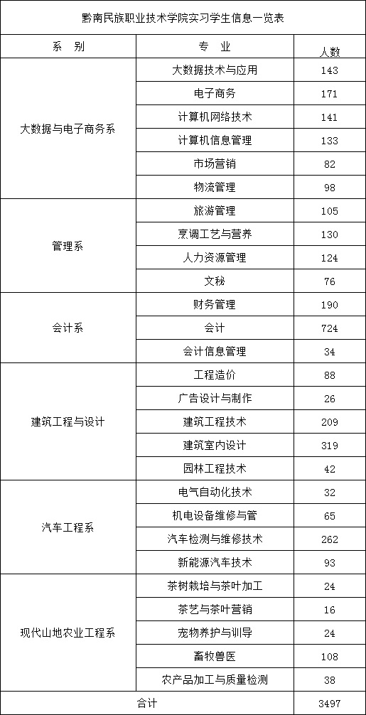 | 专业名称 | 安置或实习人数 | 男女比例 | 安置或实习时间 |