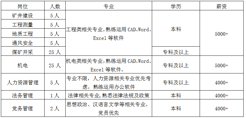 | 矿建及开采技术员 | 煤矿建设及开采 | 20 | 11-12 | |