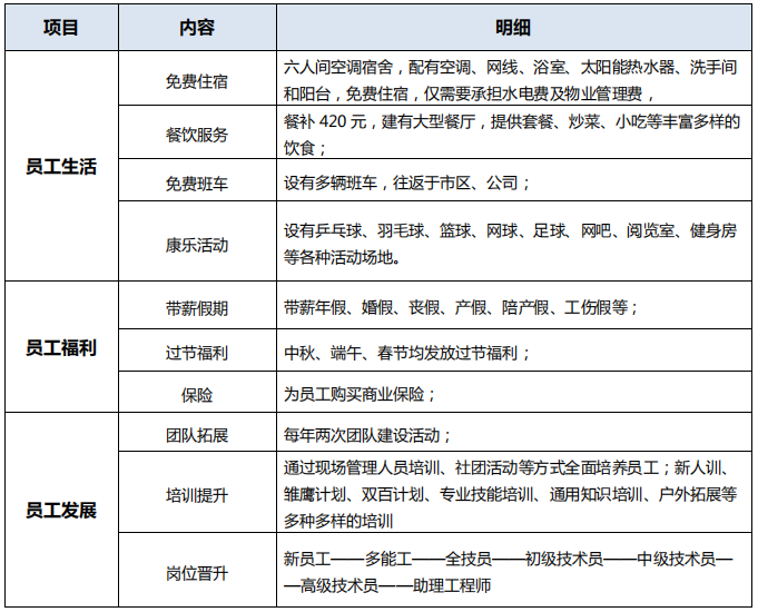福利:商业保险、节日福利、员工宿舍、班车、每年一次免费健康体检等