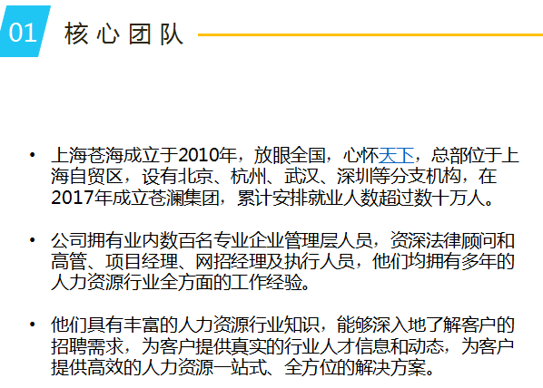 上海苍海企业管理咨询有限公司,成立于2010年,是国内领先的人力资源服务机构,公司秉承“专业、专注、专有”的理念,为企业提供一站式、全方位的人力资源解决方案、服务内容包括劳务派遣和外包服务灵活用工、人才猎聘、HR管理咨询、人事代理、薪税优化等服务。