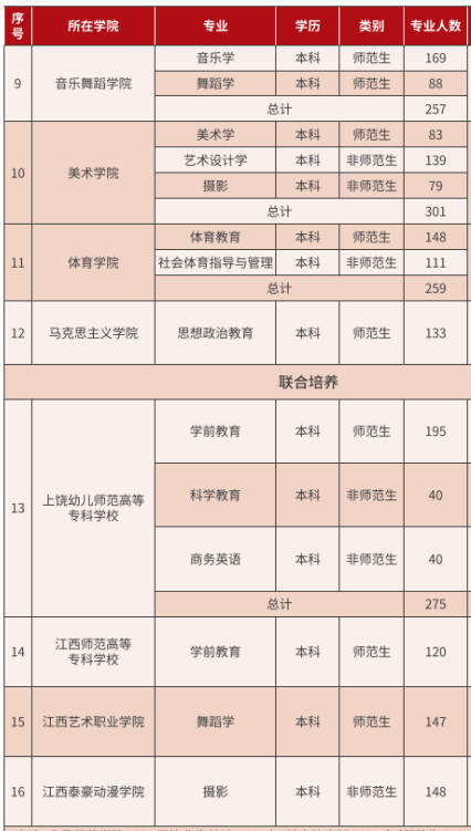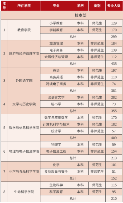 学科专业。学校现有12个教学学院、1个附属教育集团(附属中学、小学、幼儿园),设有30个本科专业,覆盖教育、艺术、管理、理、文、工、法等7个学科门类,面向24个省(自治区、直辖市)招生,全日制在校本科生1.5万余人。拥有国家一流本科专业建设点1个(学前教育)、国家级一流本科课程3门(手工制作、幼儿园环境创设、数据结构),省级一流本科专业建设点3个(汉语言文学、数学与应用数学、商务英语)、省级重点学科2个(遗传学、学前教育学)、省一流本科课程46门。15个具备认证资格的师范类专业全部通过认证,均获教师资格证免试认定资格。建有旅游实训基地、PBL互动教室、现代教育技术实训室、书法实训室、5G智慧VR教室、学前教育手工实训室等一大批特色教育教学场地。