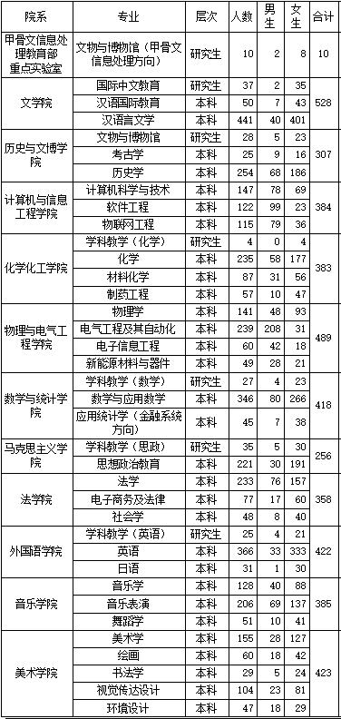长期以来,学校坚持社会主义办学方向,全面贯彻党的教育方针,逐步发展成为一所涵盖经济学、法学、教育学、文学、历史学、理学、工学、管理学、艺术学等九大学科门类的综合性大学。学校占地1380亩,建筑面积62.14万平方米,教学科研仪器设备总值3.62亿元,馆藏纸质图书220万册。设有21个教学院部和1个继续教育学院,3个硕士专业学位授权点、64个本科专业,拥有河南省特色骨干学科建设学科群1个、河南省一级学科重点学科3个、二级学科重点学科4个。学校面向全国20个省(市、自治区)招生,现有普通全日制在校生26000余人。