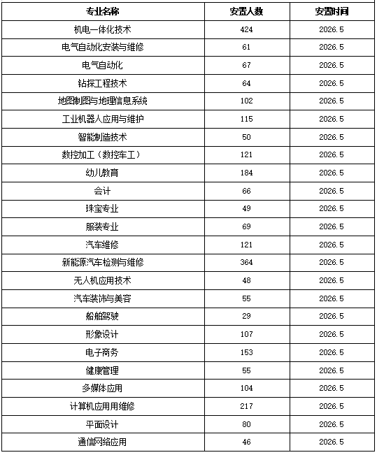 专业名称 安置或实习人数 男女比例 安置或实习时间