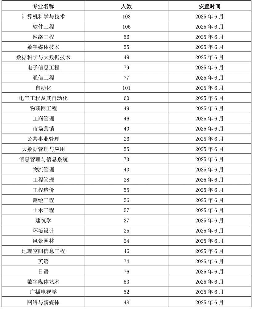 学院2025年共有1639名本科毕业生,分布在计算机科学与技术、软件工程、网络工程、数字媒体技术、数据科学与大数据技术、电子信息工程、通信工程、自动化、电气工程及其自动化、物联网工程、工商管理、市场营销、公共事业管理、信息管理与信息系统、物流管理、大数据管理与应用、工程管理、工程造价、测绘工程、土木工程、建筑学、环境设计、风景园林、地理空间信息工程、英语、日语、数字媒体艺术、广播电视学、网络与新媒体等专业。学生在校期间受到良好的教育,具有较强的岗位工作适应性。