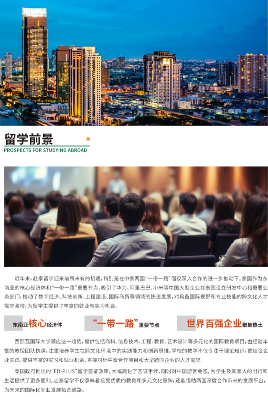 公司与泰国西那瓦国际大学建立了长期稳定的合作关系,该校是一所享誉国际的高等教育机构,以其优质的教育资源和国际化的教学环境而著称。我们与西那瓦国际大学的合作涵盖了本科、硕士及博士等多个层次的留学项目,为学生提供了丰富的专业选择和学术研究机会。