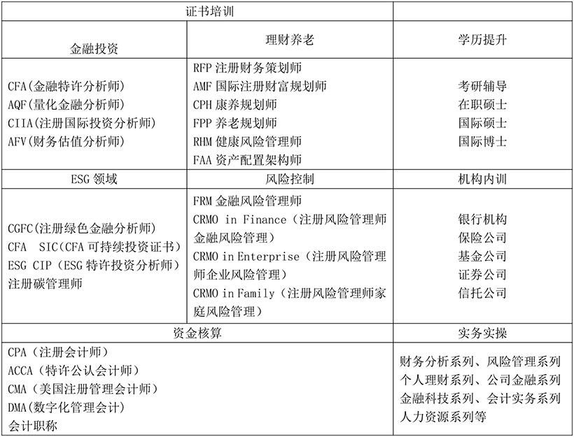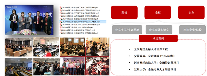 已与多家高校达成合作包含不仅限于以下形式:河南财经政法大学CFA方向班、湖南财政经济学院CFA&FRM建制班、上海商学院CFA方向班、西安欧亚学院CFA特色班、中国海洋大学CFA方向班、首都经济贸易大学投资专业课、温州大学专项课程培训项目、成都锦城学院专题课程培训项目、北京化工大学注册国际投资分析师方向班、山西工商学院FRM方向班、防灾科技学院-CFRM师资培训、江西理工大学-FRM示范课程等。