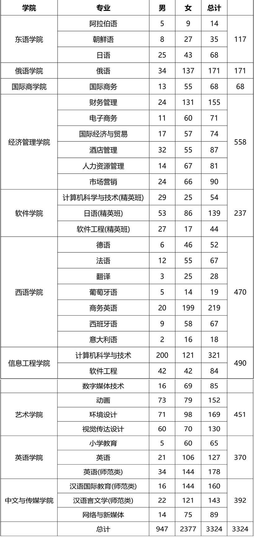 专业特色突出。学校开设32个本科专业,11个外语语种,以“外语+、+外语”为办学特色,构建了以外语类专业群为主体,以智慧工科类专业群、商贸文科类专业群为两翼,文学、工学、经济学、管理学、艺术学、教育学等多学科交叉互融、专业协调发展的学科专业体系。设有英语、俄语、东语、西语、中文与传媒、艺术、经济管理、信息工程、软件学院、国际商学院共10个学院,以及马克思主义学院、公共外语教研部、体育教研部、创新创业学院等教学部门。
