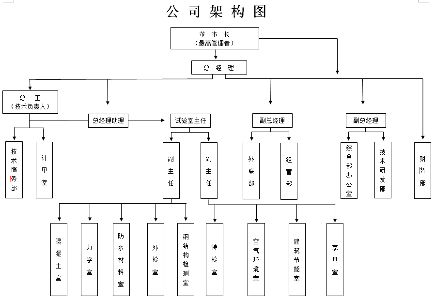 目前设总经办、财务部、经营开发部、技术服务部、计量室、外联部、技术研发部、综合部办公室、试验室等九个部门,其中试验室下设建材室、混凝土室、力学室、化学分析室、道砟室、结构室、土工室、天平室、纤维检验室、防水材料室、外检室、钢结构检测室、特检室、空气环境室、建筑节能室、家俱室水泥室、结构检测等十七个检测分室。