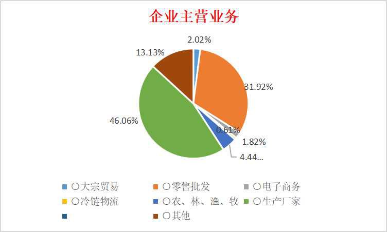 企业主营业务以零售批发(31.92%)、生产厂家(46.06%)为主,以及大宗贸易(2.02%)、农林渔牧(4.44%)、电子商务(1.82%)、冷链物流(0.61),其它(13.13%)。