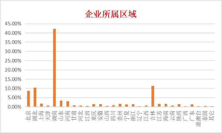 ● 地域分布广泛 从省份分布上,共有26个省份企业参与,主要是北京(8.69%)、湖北(10.30%)、上海(1.82%)、天津(0.61%)、湖南(42.22%)、山东(3.43%)、河南(3.03%)、甘肃(0.81%)、河北(0.61%)、江西(0.2%)、重庆(1.41%)、安徽(1.41%)、山西(0.2%)、四川(0.81%)、贵州(1.62%)、宁夏(1.21%)、浙江(1.41%)、辽宁(0.4%)、江西(0.61%)、吉林(11.31%)、江苏(1.62%)、海南(1.62%)、云南(0.61%)、陕西(1.41%)、广西(0.4%)、广东(1.21%)等。