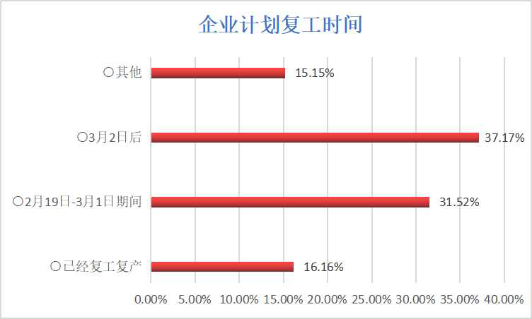 ● 企业计划复工时间 截至2020年2月21日17:00,复工情况及计划复工整体比较好,问卷企业中80家(16.16%)企业已经复工,主要是零售企业已经复工,在疫情期间全力确保百姓民生商品供应;2月19-3月1日期间复工的企业156家(31.52%),目前以居家办公为主,并制定了复工的工作计划和方案;3月2日后复工企业184家(37.17%);其它时间复工的企业75家(15.15%)。
