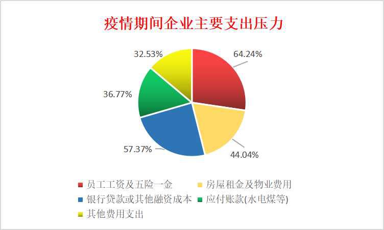 ● 疫情期间企业主要支出压力 318家企业认为是员工工资及五险一金(64.24%),284家是银行贷款或其他融资成本(57.37%),218家是房屋租金及物业费用(44.04%),182家是应付账款及日常支出的水电煤(36.77%),162家是其他支出费用(32.53%)。