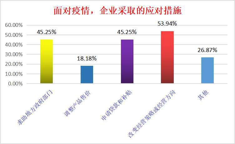 ● 面对疫情企业采取的措施 目前各企业积极恢复运营,267家企业改变经营策略或经营方向(53.94%),224家企业申请贷款和补贴(45.25%),224家企业求助地方政府部门(45.25%),90家企业调整商品售价(18.18%),133家采用压缩成本等办法应对(26.87%)。企业通过以上的措施办法,目的是减少运营中受到更大的负面影响,以及保证企业的正常运营。