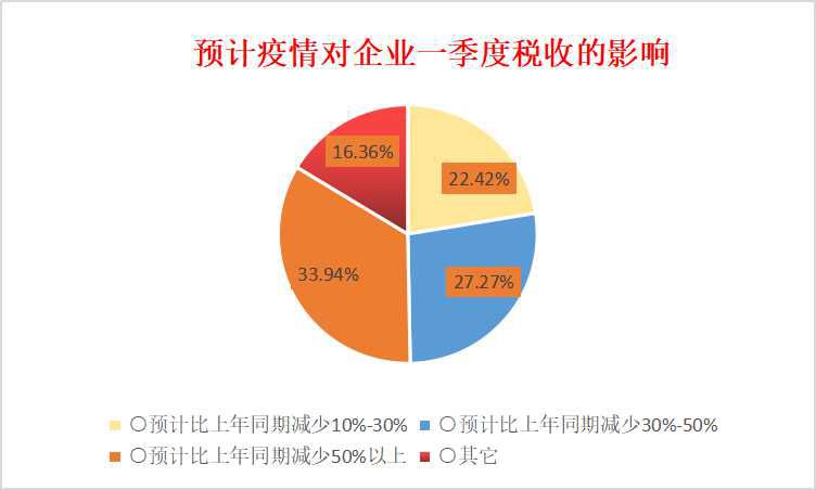 ● 受访者预计疫情对企业一季度税收的影响 111家(22.42%)企业预计比上年同期减少10%-30%,135家(27.27%)企业预计比上年同期减少30%-50%,168家企业(50%)预计比上年同期减少50%以上,80家企业(16.36%)为其他。