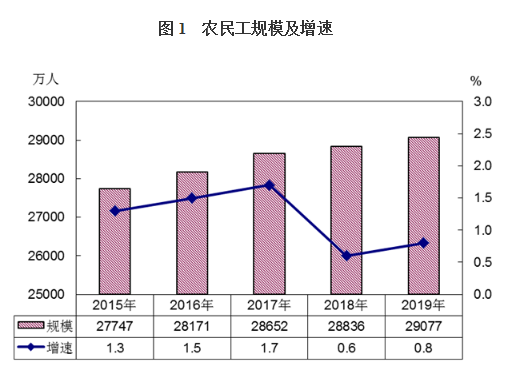 (一)农民工规模继续扩大,省内流动继续增加 2019年农民工总量达到29077万人,比上年增加241万人,增长0.8%。其中,本地农民工11652万人,比上年增加82万人,增长0.7%;外出农民工17425万人,比上年增加159万人,增长0.9%。在外出农民工中,年末在城镇居住的进城农民工13500万人,与上年基本持平。