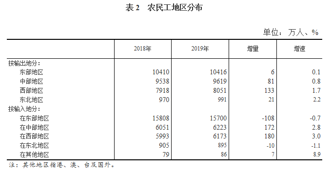 在外出农民工中,在省内就业的农民工9917万人,比上年增加245万人,增长2.5%;跨省流动农民工7508万人,比上年减少86万人,下降1.1%。省内就业农民工占外出农民工的56.9%,所占比重比上年提高0.9个百分点。分地区看,除东北地区省内就业农民工占外出农民工的比重比上年下降3.4个百分点以外,东部、中部和西部地区省内就业农民工占比分别比上年提高0.1、1.4和1.2个百分点。