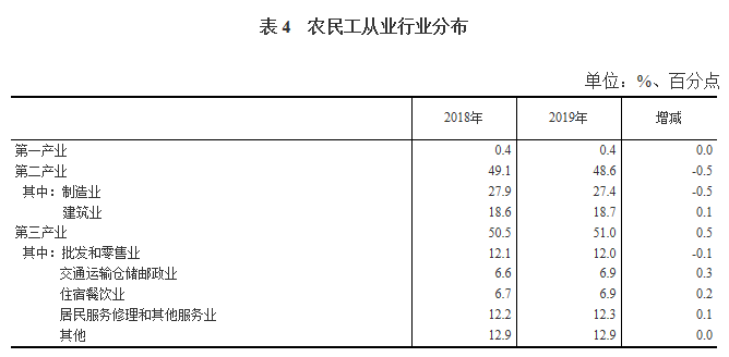 (一)第三产业就业比重继续提高 从事第三产业的农民工比重为51%,比上年提高0.5个百分点。其中,从事交通运输仓储邮政业和住宿餐饮业的农民工比重均为6.9%,分别比上年提高0.3和0.2个百分点。从事第二产业的农民工比重为48.6%,比上年下降0.5个百分点。其中,从事制造业的农民工比重为27.4%,比上年下降0.5个百分点;从事建筑业的农民工比重为18.7%,比上年提高0.1个百分点。