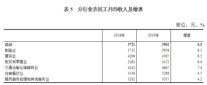 农民工月均收入3962元,比上年增加241元,增长6.5%,农民工集中就业的六大行业月均收入均稳定增长。其中,从事制造业农民工月均收入3958元,比上年增加226元,增长6.1%;从事建筑业农民工月均收入4567元,比上年增加358元,增长8.5%;从事批发和零售业农民工月均收入3472元,比上年增加209元,增长6.4%;从事交通运输仓储邮政业农民工月均收入4667元,比上年增加322元,增长7.4%;从事住宿餐饮业农民工月均收入3289元,比上年增加141元,增长4.5%;从事居民服务修理和其他服务业农民工月均收入3337元,比上年增加135元,增长4.2%。