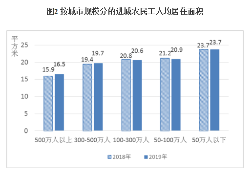 进城农民工人均居住面积20.4平方米,比上年提高0.2平方米。其中,在500万人以上城市人均居住面积增加较多,由上年的15.9平方米提高到16.5平方米;在300-500万人口城市人均居住面积为19.7平方米,比上年提高0.3平方米。