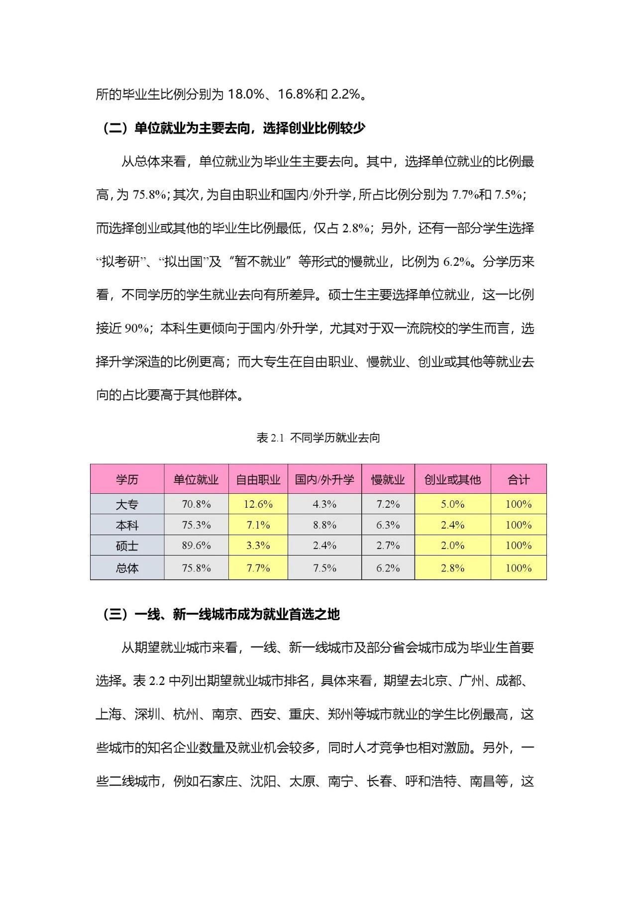 从总体来看,单位就业为毕业生主要去向。其中,选择单位就业的比例最高,为75.8%;其次为自由职业和国内/外升学,所占比例分别为7.7%和7.5%;而选择创业或其他的毕业生比例最低,仅占2.8%;另外,还有一部分学生选择“拟考研”、“拟出国”及“暂不就业”等形式的慢就业,比例为6.2%。