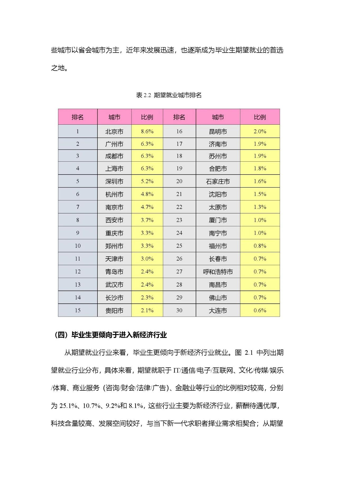 从期望就业城市来看,一线、新一线城市及部分省会城市成为毕业生首要选择。期望去北京、广州、成都、上海、深圳、杭州、南京、西安、重庆、郑州等城市就业的学生比例最高。