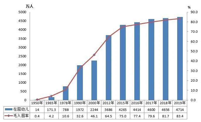 二、学前教育 全国共有幼儿园28.12万所,比上年增加1.45万所,增长5.44%。学前教育入园幼儿[2]1688.23万人;在园幼儿[3]4713.88万人,比上年增加57.46万人,增长1.23%。学前教育毛入园率[4]达到83.4%,比上年提高1.7个百分点。