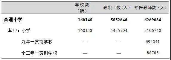 小学教职工[7]585.26万人,比上年增加12.01万人,增长2.10%;专任教师[8]626.91万人,比上年增加17.72万人,增长2.91%。专任教师学历合格率[9]99.97%,与上年持平。生师比16.85:1。