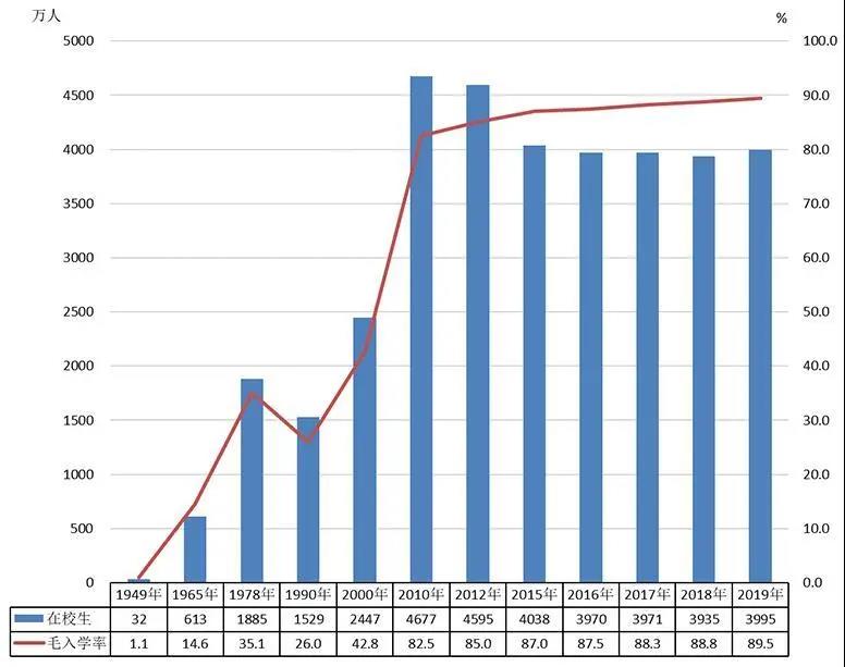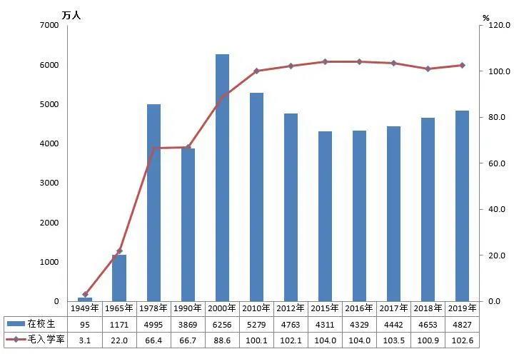 注释: [1]各项统计数据均未包括香港特别行政区、澳门特别行政区和台湾省。部分数据因四舍五入的原因,存在着与分项合计不等的情况。 [2]含独立设置的幼儿园和附设幼儿班幼儿。2019年,根据教育事业发展情况对学前教育入园幼儿指标进行修订,数据与往年不具可比性。 [3]含独立设置的幼儿园和附设幼儿班幼儿。 [4]毛入学率,是指某一级教育不分年龄的在校学生总数占该级教育国家规定年龄组人口数的百分比。由于包含非正规年龄组(低龄或超龄)学生,毛入学率可能会超过100%。 [5]九年义务教育巩固率,是指初中毕业班学生数占该年级入小学一年级时学生数的百分比。 [6]小学学龄儿童净入学率,是指小学教育在校学龄人口数占小学教育国家规定年龄组人口总数的百分比,是按各地不同入学年龄和学制分别计算的。 [7]因九年一贯制学校的教职工数计入初中阶段教育,完全中学、十二年一贯制学校的教职工数计入高中阶段教育,而专任教师是按照教育层次进行归类,存在小学教职工数据小于专任教师数据的情况。 [8]含九年一贯制学校和十二年一贯制学校小学段专任教师。 [9]专任教师学历合格率,是指某一级教育具有国家规定的最低学历要求的专任教师数占该级教育专任教师总数的百分比。各级教育教师的最低学历要求,参照《中华人民共和国教师法》中的相关规定:取得小学教师资格,应当具备中等师范学校毕业及其以上学历;取得初级中学教师、初级职业学校文化、专业课教师资格,应当具备高等师范专科学校或者其他大学专科毕业及其以上学历;取得高级中学教师资格和中等专业学校、技工学校、职业高中文化课、专业课教师资格,应当具备高等师范院校本科或者其他大学本科毕业及其以上学历。 [10]设施设备配备达标的学校,是指体育运动场(馆)面积、体育器械配备达到《教育部卫生部财政部关于印发国家学校体育卫生条件试行基本标准的通知》(教体艺﹝2008﹞5号)的相关标准;音乐器材配备、美术器材配备、数学自然实验仪器、理科实验仪器等达到各省、自治区、直辖市规定的仪器配备相关标准。含普通小学、初中和普通高中。 [11]含九年一贯制学校、十二年一贯制学校和完全中学初中段专任教师。 [12]进城务工人员随迁子女,是指户籍登记在外省(区、市)、本省外县(区)的乡村,随务工父母到输入地的城区、镇区(同住)并接受义务教育的适龄儿童少年。 [13]含特殊教育学校、附设特教班、随班就读和送教上门学生。 [14]含特殊教育学校、普通小学、初中送教上门学生。 [15]高中阶段包括普通高中、成人高中、中等职业学校。 [16]中等职业教育包括普通中等专业学校、职业高中、技工学校和成人中等专业学校。 [17]中等职业学校生师比不含技工学校数据。 [18]包括研究生、普通本专科、成人本专科、网络本专科、高等教育自学考试本专科等各种形式的高等教育在学人数。 [19]普通高等学校校均规模,仅含普通本专科在校生,不含分校点数据。 [20] 根据教育部办公厅《关于统筹全日制和非全日制研究生管理工作的通知》(教研厅[2016]2号)有关要求,2017年起研究生招生、在校生指标内涵发生变化,增加了非全日制研究生数据。 [21]普通高等学校生师比,不含分校点数据,学生总数为折合学生数。 [22] [23]包括学校产权和非产权独立使用。 [24]民办中等职业教育未含技工学校数据。