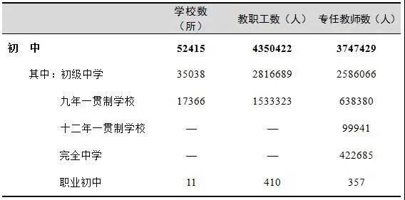 初中教职工435.04万人,比上年增加15.67万人,增长3.74%;专任教师[11]374.74万人,比上年增加10.84万人,增长2.98%。初中专任教师学历合格率99.88%,比上年提高0.02个百分点。生师比12.88:1。