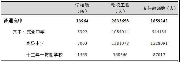 1.普通高中 普通高中1.40万所,比上年增加227所,增长1.65%;招生839.49万人,比上年增加46.79万人,增长5.90%;在校生2414.31万人,比上年增加38.93万人,增长1.64%;毕业生789.25万人,比上年增加10.01万人,增长1.28%。 普通高中教职工283.37万人,比上年增加9.11万人,增长3.32%;专任教师185.92万人,比上年增加4.67万人,增长2.57%。生师比12.99:1;专任教师学历合格率98.62%,比上年提高0.21个百分点。