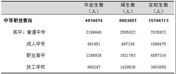 普通高中校舍建筑面积56788.56万平方米,比上年增加2582.51万平方米。普通高中设施设备配备达标的学校比例情况分别为:体育运动场(馆)面积达标学校91.62%,体育器械配备达标学校94.20%,音乐器材配备达标学校93.20%,美术器材配备达标学校93.31%,理科实验仪器达标学校93.84%。 2.成人高中 成人高中333所,比上年减少21所;在校生4.12万人,毕业生3.42万人。成人高中教职工2509人,专任教师1933人。 3.中等职业教育[16] 中等职业学校1.01万所,比上年减少151所。其中,普通中等专业学校3339所,比上年增加17所;成人中等专业学校1032所,比上年减少65所;职业高中3315所,比上年减少116所;技工学校2392所,比上年增加13所。 中等职业教育招生600.37万人,比上年增加43.32万人,占高中阶段教育招生总数的41.70%。其中,普通中专招生255.50万人,比上年增加13.57万人;成人中专招生49.73万人,比上年增加3.48万人;职业高中招生152.18万人,比上年增加11.86万人;技工学校招生142.95万人,比上年增加14.41万人。 中等职业教育在校生1576.47万人,比上年增加21.21万人,占高中阶段教育在校生总数的39.46%。其中,普通中专在校生703.59万人,比上年增加4.17万人;成人中专在校生106.85万人,比上年减少6.28万人;职业高中在校生405.73万人,比上年增加4.65万人;技工学校在校生360.31万人,比上年增加18.67万人。 中等职业教育毕业生493.47万人,比上年增加6.19万人。其中,普通中专毕业生219.96万人,比上年增加1.38万人;成人中专毕业生48.19万人,比上年减少2.91万人;职业高中毕业生126.89万人,比上年减少0.40万人;技工学校毕业生98.42万人,比上年增加8.13万人。