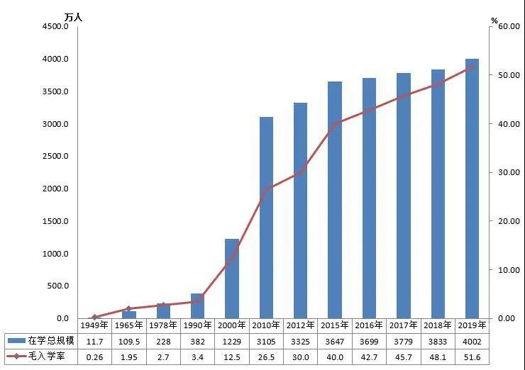 六、高等教育 全国各类高等教育在学总规模[18]4002万人,高等教育毛入学率51.6%。全国共有普通高等学校2688所(含独立学院257所),比上年增加25所,增长0.94%。其中,本科院校1265所,比上年增加20所;高职(专科)院校1423所,比上年增加5所。全国共有成人高等学校268所,比上年减少9所;研究生培养机构828个,其中,普通高等学校593个,科研机构235个。普通高等学校校均规模[19]11260人,其中,本科院校15179人,高职(专科)院校7776人。