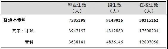 研究生招生[20]91.65万人,其中,招收博士生10.52万人,招收硕士生81.13万人。在学研究生286.37万人,其中,在学博士生42.42万人,在学硕士生243.95万人。毕业研究生63.97万人,其中,毕业博士生6.26万人,毕业硕士生57.71万人。 普通本专科招生914.90万人,比上年增加123.91万人,增长15.67%;在校生3031.53万人,比上年增加200.49万人,增长7.08%;毕业生758.53万人,比上年增加5.22万人,增长0.69%。另有五年制高职转入专科招生46.00万人;专科起点本科招生31.75万人。