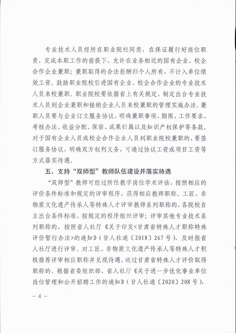各省、自治区、直辖市教育厅(教委),新疆生产建设兵团教育局: 为贯彻落实教育部、国家发展改革委、财政部、人力资源社会保障部印发的《深化新时代职业教育“双师型”教师队伍建设改革实施方案》(教师〔2019〕6号),甘肃省进一步完善职业院校人才薪酬待遇,调整绩效工资管理权限,单列引进高层次人才绩效工资,拓宽收入渠道并允许兼职取酬,支持“双师型”教师队伍建设并落实待遇。上述政策的出台,有助于提高职业院校教师队伍创新创业创造的积极性,有力推动了职业教育各项改革措施的落地。 现将甘肃省教育厅、甘肃省人力资源社会保障厅、甘肃省财政厅印发的《关于进一步完善职业院校人才薪酬待遇的通知》(甘教人〔2020〕13号)转发给你们,请结合实际学习借鉴。有关工作情况请及时报告我部(教师工作司)。 教育部办公厅 2021年1月26日