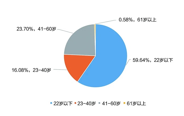 图二:调查群体学历情况 四、年龄状况 参与答题的人群中22岁以下的63293人,占59.64%,这部分人群主要是在校学生。另外,23-40岁有17070人、41-60岁有25150人、61岁以上有612人,占比分别为16.08%、23.70%、0.58%(见图三)。