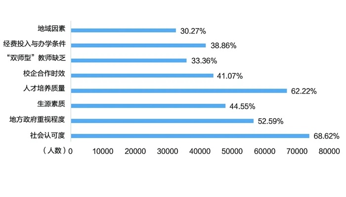图五十五:教师反馈对自身专业发展的需求 从地域来看,东、中、西部选择很强烈、强烈两项的分别占64.08%、59.21%、55.10%,说明东、中、西部教师对自身专业发展的要求呈递减趋势,且存在显著差异。 第七部分 职业教育的现状分析 本次调查坚持匿名、自愿和第三方调查、非利害关系原则,聚焦当前职业教育发展面临的热点和难点问题,试图得出广大职业院校学生、家长、教师、企业人员等各类利益相关群体对这些问题的真实看法。此外,针对部分问题,我们与部分职教工作者、企业人员等进行了深入访谈,以期了解数据背后的问题。 一、职业教育的社会认可度有待提高 根据报告的数据,可以看出,职业教育作为一种教育类型,其定位和功能已被大众熟知、承认。报告中,调查对象对职业教育的期望排前两位的分别是培养高素质技能人才、加强职业道德素质的培养。由此可见,大家非常清楚选择就读职业院校就是选择技术岗位,做技能型人才。 尽管职业教育作为教育类型被承认,但是,多项数据共同表明社会对职业教育的认可度还有待提高。从对职业教育发展的担忧来看,学生和家长选择职业教育发展面临的最大困难,均把社会认可度排在前列,尤其是学生选择该选项的比排第二位的多了约8个百分点,说明他们对自己就读的学校以及将来的文凭、就业竞争力等严重缺乏自信。教师群体认为职业教育发展的最大困难是生源素质,占70.98%,说明教师对职校学生不十分认可。 报告中,从对职业教育的期望来看,中职学生认为需要进入高校学习的达84.31%,部分地区高达90%以上;高职学生选择希望继续升入高校学习的占67.33%,说明中高职学生对自己的学历并不满意。从对职业院校的满意度来看,对职业院校专业课的教学效果和专业设置的总体认可度高,但对职业院校教育教学管理水平十分满意和满意的仅占57.22%,对职业院校的学生管理制度与评价机制总体感受选择很好、好的占61.64%。 调查显示,职业院校学生和家长对职业教育的接受度较高。对“您或您的孩子就读职业院校,您会觉得怎样”的问题,中职学生、高职学生和家长选择完全能接受和能够接受的分别达79.11%、74.75%和88.68%。企业人员选择完全能接受和能够接受的占比也较高,达74.31%。但教师群体选择完全能接受和能够接受的仅占56.48%,而选择不能接受的达17.12%。 根据我们的访谈情况,普遍认为因为此次调查样本为职教内部群体,所以对职教的接受度高,如果覆盖所有群体,接受度会低很多。从参与问卷调查的学生群体来说,他们已经选择了职校,能接受这一身份。作为非直接利益关切的第三方,教师群体的选择更能代表大众的选择。相对于职教学生及其家长,许多职业院校教师学历较高,从普通高中、本科院校一路就读过来,带着他们所接受的教育烙印,带着思维定式,用普通学校的标准和要求来衡量职业院校,以传统标准评判学生。 社会人群对职业教育认可度不高,与某些地方行政部门对职业教育重视不够、社会唯学历论、传统的偏见等都有关系。青岛职业技术学院原院长覃川认为,一直以来人们都认为职业教育的层次低于普通教育,觉得职校毕业后从事的是低微的职业,其他类型教育对职业教育存在鄙视,职教人自身对职业教育也没有信心。 一位企业部门负责人认为,社会观念、对职教的评价体系亟须更新。“有的孩子确实学习成绩不好,但他动手能力很强。对职校学生,需要有更科学的评价体系。”此外,该企业人员还表示,现在社会整体对职业院校学生有“歧视”。企业对不同学历学生有不同薪酬标准,拿20万、30万年薪招研究生,但职业院校学生每月工资仅几千元,岗位也有层级限制。“职业院校也有很多优秀的学生。从社会薪酬分配机制上,能不能让他们待遇高一些?”他认为地方政府部门对职校学生认可也不够,如在公务员招考等方面对职业院校学生设置过高门槛。 可见,科学评价职业院校学生,让毕业生就业不受歧视,让高素质产业工人拿到与其他学历层次同等的薪酬,职业教育认可度有望提升。 二、职业院校的内涵建设有待提升 首先是职业院校教师的学历普遍偏低。大专及以下的还有6.85%,本科72.84%,硕士19.73%,博士仅0.58%,即便是考虑到职业院校“双师型”教师队伍建设的特殊情况,这样的学历结构也很难保证教育质量;高职院校属于国家高等教育序列,需要一批高素质、高学历的教师;未来,包括制造业在内的各行各业向高端化转型,也需要高素质人才来推动发展,而高素质人才培养需要高素质教师。 其次,职业教育普通教育化现象比较明显。数据表明,近6成学生对职业教育培养技能人才的重要方式——现代学徒制、“1+x”证书制度等不太了解。通过对职教人的访谈,我们发现不少中职学校都以升学为取向。一职业学校负责人直言学校这几年比较偏重升学,依托“五年一贯制”“3+4”“职教高考”这些通道,学校的整体升学率达到90%以上。我们在访谈中还发现,有的中职学校参加升学考试的学生本科录取率近90%,有的中职学校学生就业率不到10%。 如果职校也跟普通中学一样偏重升学,职业教育的定位如何体现?针对这一疑问,一位职业院校负责人表示:“职业教育的定位是服务发展促进就业。学生升学,最终肯定是促进人的发展、社会的发展;升入高一级学校继续学习应用型技能,依然属于职业教育的整体范