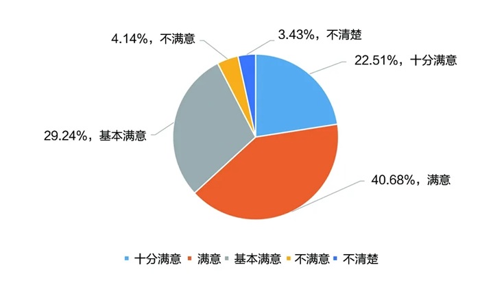 图十七:教师群体对职业院校教育教学管理水平满意度 调查发现,职业院校的思政教育实施情况较好,选择基本满意及以上的比例为92.43%,选择不满意、不清楚的分别为4.14%和3.43%(见图十八)。