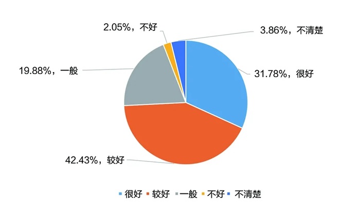 图二十五:职业院校的学生的整体状态 此外,受访者对职业院校的学生管理制度与评价机制总体感受选择很好、好、一般、不好和不清楚的分别占23.57%、38.07%、30.94%、3.74%和3.68%(见图二十六)。由此看来,职业院校的教育教学管理整体水平尚可。
