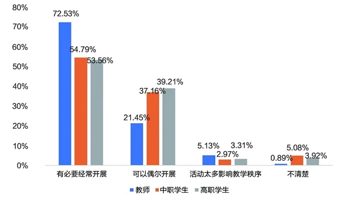 图二十九:对学校开展竞赛等活动的看法 但是从不同身份群体来看,教师、中职学生和高职学生选择有必要经常开展的分别占72.53%、54.79%和53.56%,说明中职学生和高职学生对学校开展各类活动的积极性显著低于教师(见图三十)。