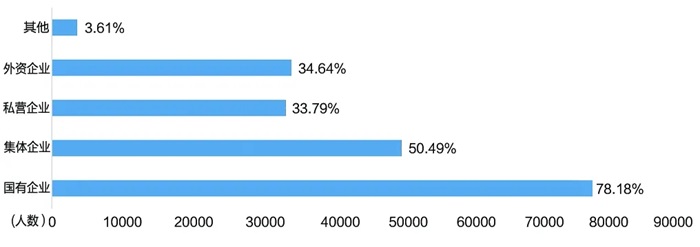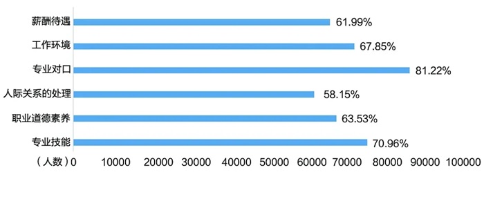 图三十四:教师、家长和全体人员对学生就业稳定情况的反映 问卷设计了调查影响毕业生就业稳定率的因素(多选)。从数据看,影响毕业生就业稳定率因素排名前三的依次是专业对口、专业技能、工作环境,分别为81.22%、70.96%和67.85%(见图三十五)。而从企业人员的选择来看,影响毕业生就业稳定率的因素排前三位是专业对口、专业技能、职业道德,所占比例分别为77.31%、74.75%和67.03%。由此可见,职业院校在人才培养过程中,需要更加重视学生的专业技能和职业道德的培养,在指导学生就业时需要更加重视专业对口。