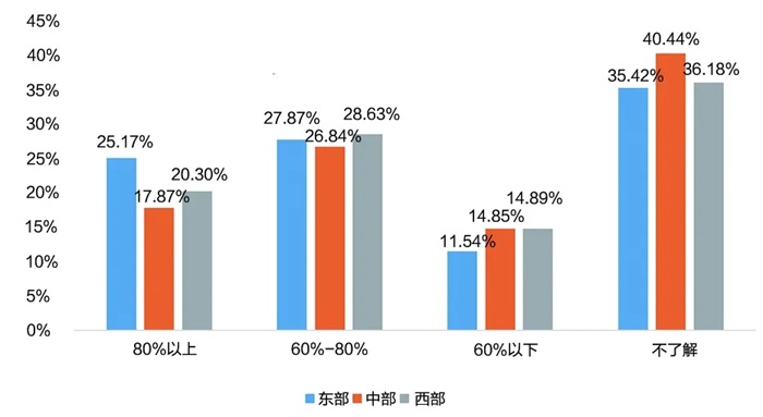 图三十六:毕业生本地就业情况 从地域分布来看,东、中、西部职业院校学生本地就业率在80%以上的分别为25.17%、17.87%、20.30%(见图三十七)。中、西地区职业院校毕业生本地就业率显著低于东部地区。