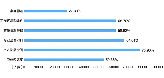 图三十八:企业聘用员工时最看重的素质 单从企业人员的数据反馈来看,他们选择最看重的素质排前三位的是工作态度、团队合作和沟通、实践经验,分别占84.69%、75.00%和65.16%。从教师反馈的数据来看,他们选择最看重的素质排前三位的是工作态度、学历、团队合作和沟通,分别占88.37%、77.73%、76.42%。说明企业人员对员工的要求和教师对学生的培养目标不是十分匹配。 从职业院校学生选择工作时最重视的因素来看(多选),排前四位的依次是个人发展空间、专业是否对口、工作环境和条件、薪酬福利待遇,分别达73.96%、64.01%、58.78%和58.63%(见图三十九)。值得关注的是,职业院校毕业生择业的自主性比较强,在求职过程中受家庭影响不大,仅占27.39%。