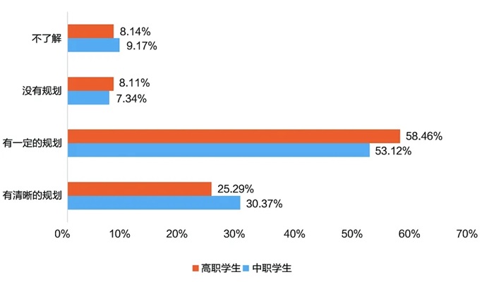 图三十九:职业院校学生选择工作单位重视的因素 三、学生职业准备情况 针对学生职业准备情况的调查发现,职业院校学生普遍对自己的职业生涯规划不够重视。对中职学生和高职学生的数据进行比较分析,中职学生选择有清晰规划的仅占30.37%,而选择没有规划和不了解的达16.51%;高职学生选择有清晰规划的占25.29%,而选择没有规划和不了解的达16.25%(见图四十)。