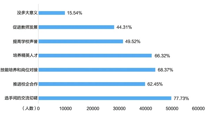 图四十:中职和高职学生职业规划情况 同时,还对职业院校举办学生技能大赛进行了调查(多选)。数据显示,绝大部分学生认为职业院校举办技能大赛很有意义。其中排前三位的选项分别是:有利于选手间的交流与切磋、有利于技能培养和岗位对接、有利于培养精英人才,分别占77.73%、68.37%和66.32%(见图四十一)。
