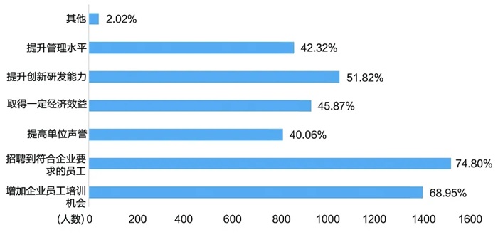 图四十九:教师和企业人员认为职业院校为企业提供技术服务情况 单从企业人员反映的数据来看,企业在校企合作中的受益(多选),排序为:招聘到符合企业要求的员工、增加企业员工培训机会、提升创新研发能力、取得一定经济效益、提升管理水平、提高单位声誉、其他,比例分别为74.80%、68.95%、51.82%、45.87%、42.32%、40.06%、2.02%(见图五十),可见企业在校企合作中受益的主要方面是人才队伍建设,而非经济效益。