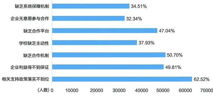 图五十一:校企合作持续开展的决定因素 分析制约校企合作的相关因素(多选),各项排列次序为:相关支持政策落实不到位、缺乏合作机制、企业利益得不到保证、缺乏合作平台、学校缺乏主动性、缺乏系统保障机制、企业无意愿参与合作,分别占62.52%、50.70%、49.81%、47.04%、37.93%、34.51%和32.34%,其中选择支持政策落实不到位的明显高于其他选项(见图五十二)。